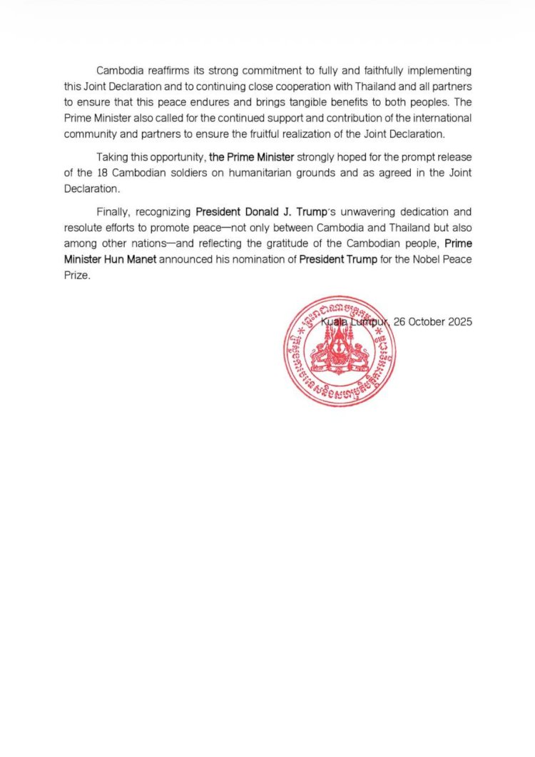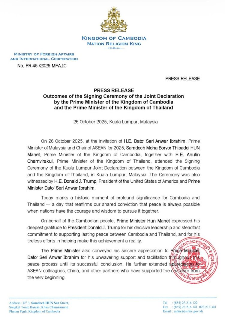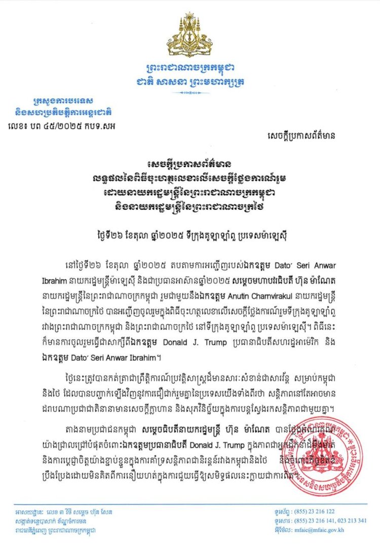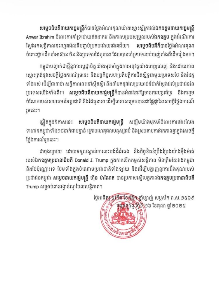 លទ្ធផលនៃពិធីចុះហត្ថលេខាលើសេចក្តីថ្លែងការណ៍រួម ដោយនាយករដ្ឋមន្ត្រីនៃព្រះរាជាណាចក្រកម្ពុជា និងនាយករដ្ឋមន្ត្រីនៃព្រះរាជាណាចក្រថៃ នៅក្នុងកិច្ចប្រជុំកំពូលអាស៊ាន លើកទី៤៧ (កិច្ចប្រជុំពេញអង្គ) ថ្ងៃអាទិត្យ ៥ កើត ខែកត្តិក ឆ្នាំម្សាញ់ សប្តស័ក ពុទ្ធសករាជ ២៥៦៩ ត្រូវនឹងថ្ងៃទី២៦ ខែតុលា ឆ្នាំ២០២៥។