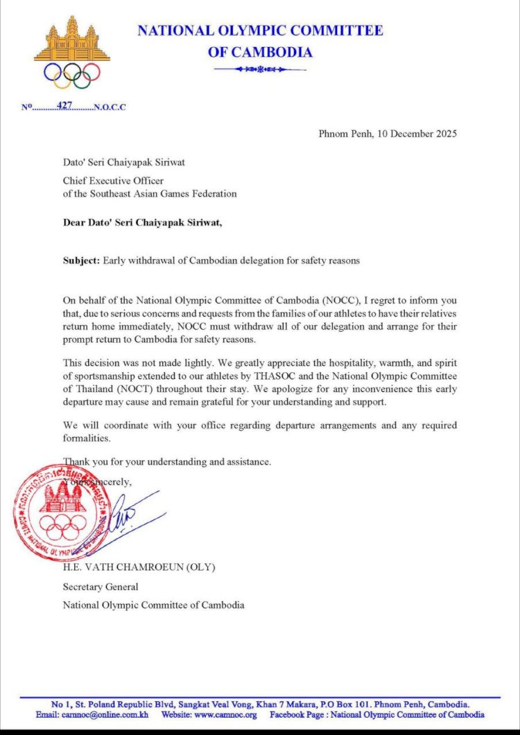 (ភ្នំពេញ)៖ ថ្ងៃពុធ ៥រោច ខែមិគសិរ ឆ្នាំម្សាញ់ សប្តស័ក ពុទ្ធសករាជ ២៥៦៩ ត្រូវនឹងថ្ងៃទី១០ ខែធ្នូ ឆ្នាំ២០២៥ គណៈកម្មាធិការជាតិអូឡាំពិកកម្ពុជា (NOCC) បានធ្វើការជូនដំណឹងដល់ក្រុមប្រឹក្សាកីឡាអាស៊ីអាគ្នេយ៍ និងគណៈកម្មការរៀបចំស៊ីហ្គេម ឆ្នាំ២០២៥ អំពីការសម្រេចដកខ្លួនភ្លាមៗ ដើម្បីត្រឡប់មកប្រទេសកម្ពុជាវិញ របស់ក្រុមប្រតិភូកីឡាកម្ពុជា ដោយសារក្រុមគ្រួសារប្រតិភូកីឡកម្ពុជា សម្ដែងនូវការព្រួយបារម្ភអំពីសុវត្ថិភាព។