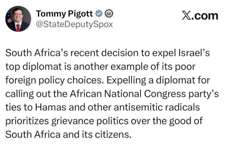 លោក Tommy Pigott (ថមមី ភិកហ្គេត) អ្នកនាំពាក្យរងក្រសួងការបរទេស បាននិយាយនៅលើបណ្តាញសង្គម X ថា ការបណ្តេញអ្នកការទូតអ៊ីស្រាអែល ពីបទចោទប្រកាន់ពីទំនាក់ទំនងរបស់គណបក្សសមាជជាតិអាហ្វ្រិកជាមួយក្រុមហាម៉ាស និងក្រុមជ្រុលនិយមប្រឆាំងពួកយូដាផ្សេងទៀត បានផ្តល់អាទិភាពដល់នយោបាយដែលមិនមានផលល្អសម្រាប់អាហ្វ្រិកខាងត្បូង និងប្រជាពលរដ្ឋរបស់ខ្លួន។