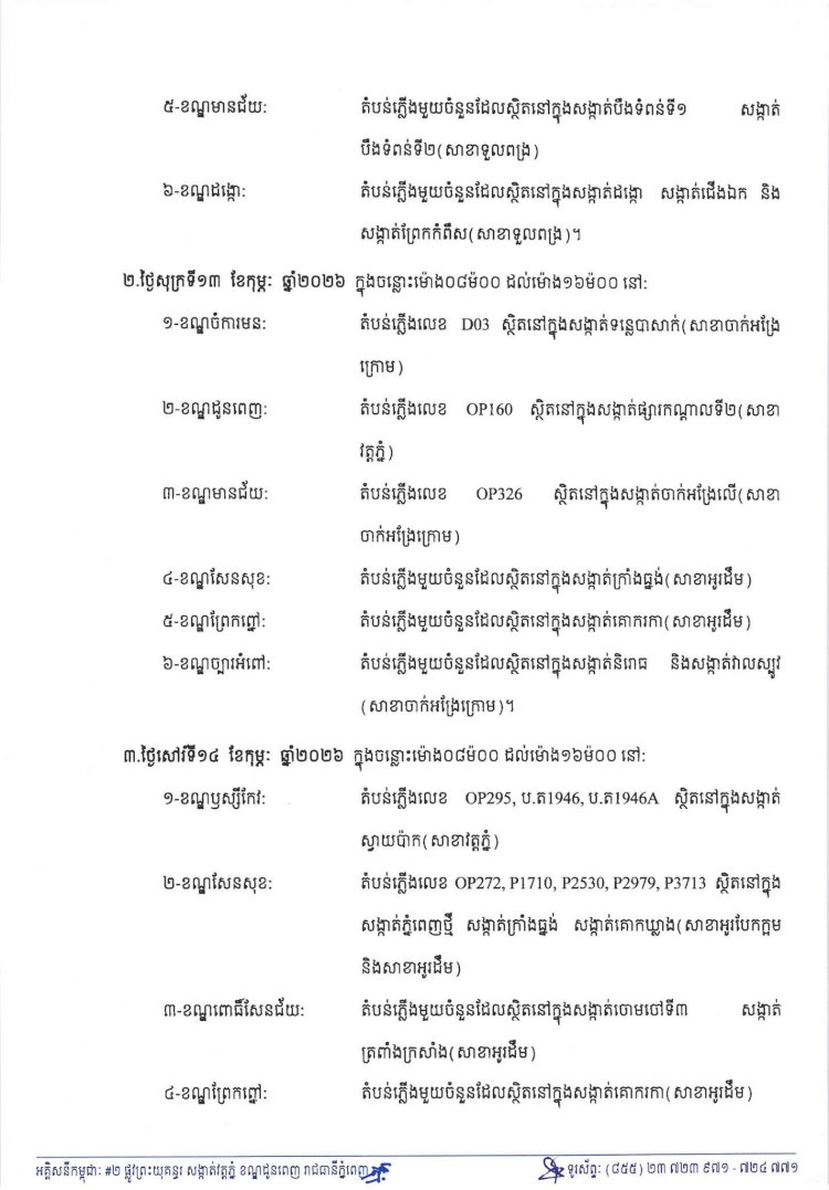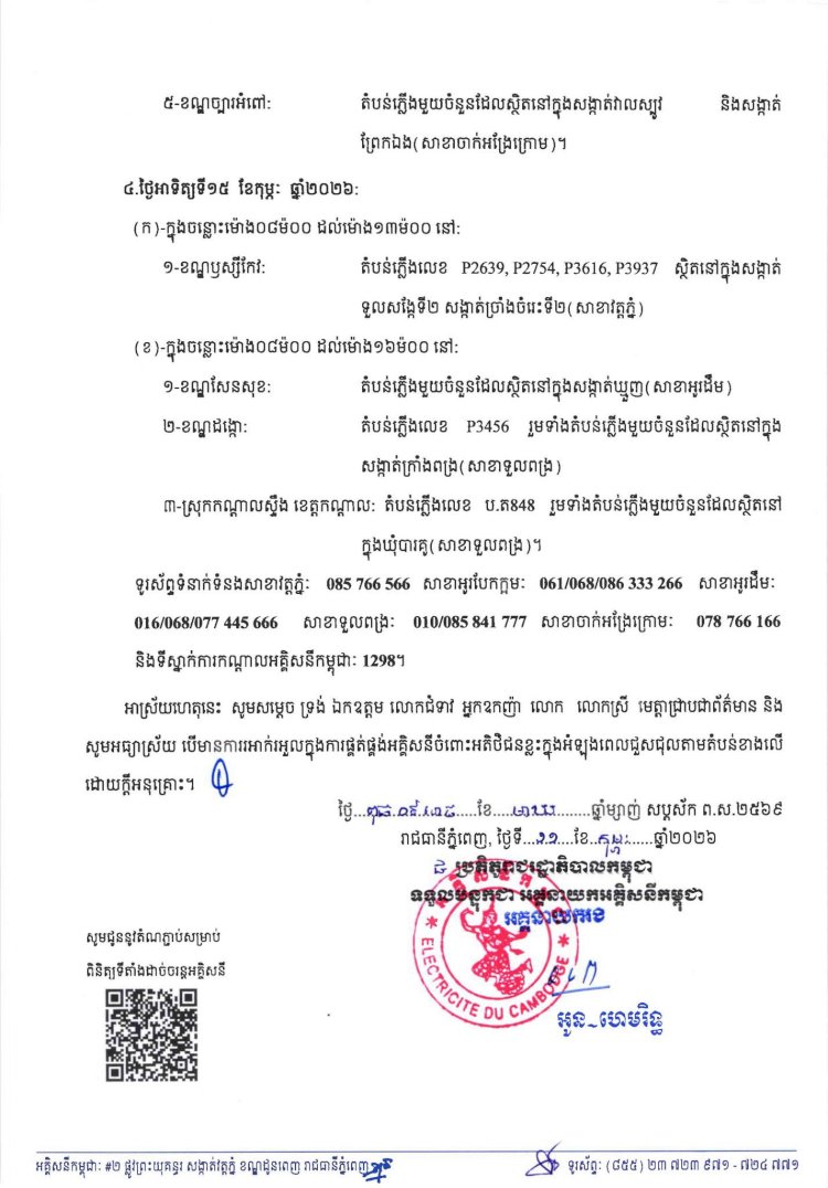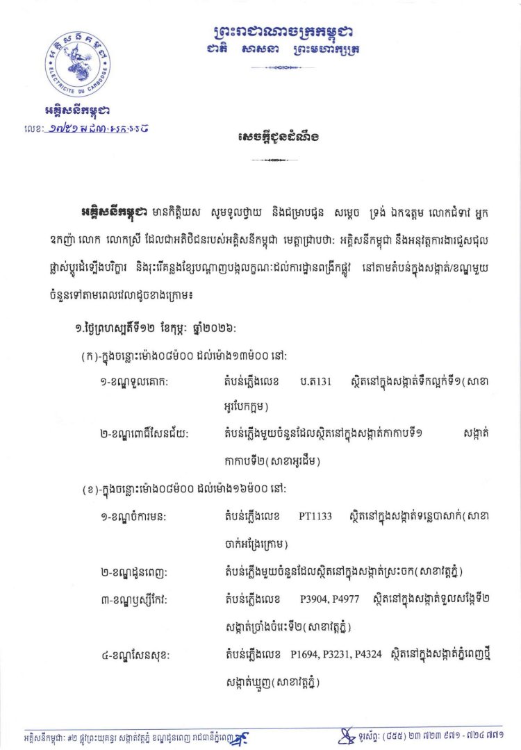 ភ្នំពេញ៖ សេចក្តីជូនដំណឹងស្តីពីការអនុវត្តការងារជួសជុល ផ្លាស់ប្តូរដំឡើងបរិក្ខារនានា និងរុះរើគន្លងខ្សែបណ្តាញអគ្គិសនីរបស់អគ្គិសនីកម្ពុជា ដើម្បីបង្កលក្ខណៈងាយស្រួលដល់ការដ្ឋានពង្រីកផ្លូវ នៅថ្ងៃទី១២ ខែកុម្ភៈ ឆ្នាំ២០២៦ ដល់ថ្ងៃទី១៥ ខែកុម្ភៈ ឆ្នាំ២០២៦ នៅតំបន់មួយចំនួនទៅតាមពេលវេលា និងទីកន្លែងដូចសេចក្តីជូនដំណឹងលម្អិតខាងក្រោម។ ទោះជាមានការខិតខំថែរក្សាមិនឱ្យមានការប៉ះពាល់ដល់ការផ្គត់ផ្គង់អគ្គិសនីធំដុំ ប៉ុន្តែការផ្គត់ផ្គង់ចរន្តអគ្គិសនីនៅតំបន់ខាងលើអាចនឹងមានការរអាក់រអួលខ្លះៗជៀសមិនផុតដែលយើងខ្ញុំស្នើសុំអភ័យទោសទុកជាមុន។ ថ្ងៃពុធ ៩រោច ខែមាឃ ឆ្នាំម្សាញ់ សប្ដស័ក ព.ស.២៥៦៩ រាជធានីភំ្នពេញ ថ្ងៃទី១១ ខែកុម្ភៈ ឆ្នាំ២០២៦