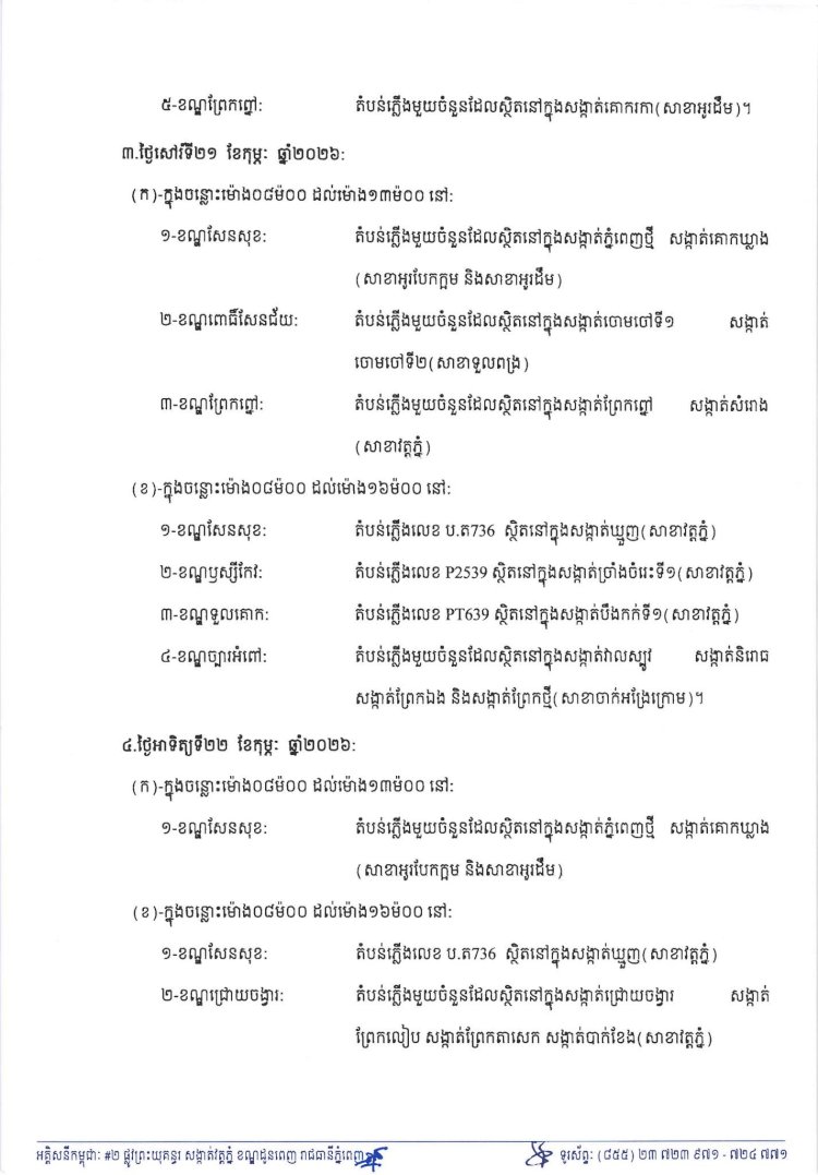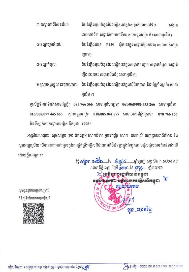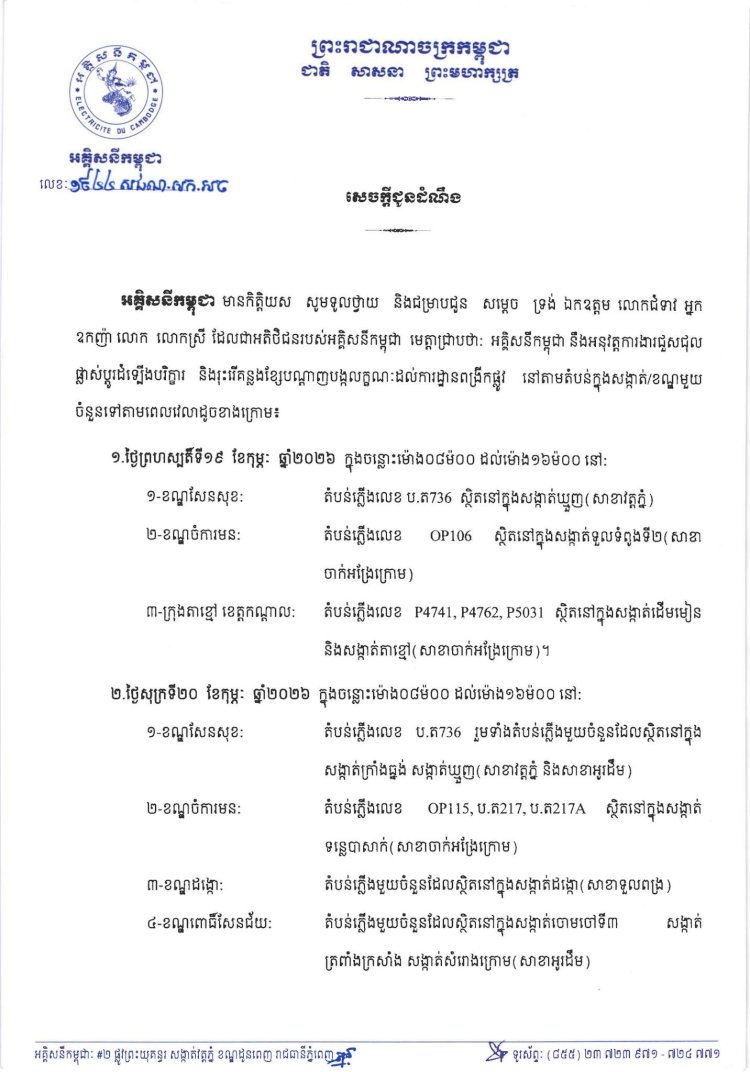 សេចក្តីជូនដំណឹងស្តីពីការអនុវត្តការងារជួសជុល ផ្លាស់ប្តូរដំឡើងបរិក្ខារនានា និងរុះរើគន្លងខ្សែបណ្តាញអគ្គិសនីរបស់អគ្គិសនីកម្ពុជា ដើម្បីបង្កលក្ខណៈងាយស្រួលដល់ការដ្ឋានពង្រីកផ្លូវ នៅថ្ងៃទី១៩ ខែកុម្ភៈ ឆ្នាំ២០២៦ ដល់ថ្ងៃទី២២ ខែកុម្ភៈ ឆ្នាំ២០២៦ នៅតំបន់មួយចំនួនទៅតាមពេលវេលា និងទីកន្លែងដូចសេចក្តីជូនដំណឹងលម្អិតខាងក្រោម។ ទោះជាមានការខិតខំថែរក្សាមិនឱ្យមានការប៉ះពាល់ដល់ការផ្គត់ផ្គង់អគ្គិសនីធំដុំ ប៉ុន្តែការផ្គត់ផ្គង់ចរន្តអគ្គិសនីនៅតំបន់ខាងលើអាចនឹងមានការរអាក់រអួលខ្លះៗជៀសមិនផុតដែលយើងខ្ញុំស្នើសុំអភ័យទោសទុកជាមុន។
